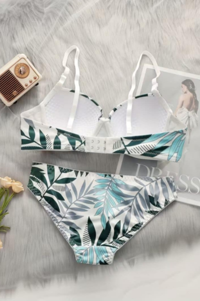 Ženski set donjeg veša – tropski dezen (grudnjak + gaćice) Unesi svežinu i stil u svakodnevicu uz ovaj atraktivan set donjeg veša sa modernim tropskim motivima. Dizajn inspirisan kupaćim kostimima daje mu poseban izgled, dok udoban kroj omogućava prijatno nošenje tokom celog dana. *✨ Karakteristike:* * Set sadrži: *grudnjak + gaćice* * Moderan *tropski dezen (listovi)* – vizuelno poput kupaćeg * Grudnjak sa *kopčanjem pozadi* i podesivim bretelama * Mekan i elastičan materijal koji se prilagođava telu * Gaćice srednje dubine – udobne i praktične * Idealan za svakodnevno nošenje ili kao atraktivan set za posebne prilike *💡 Napomena:* Ovaj model je *donji veš*, iako izgledom podseća na kupaći kostim. Nije predviđen za kupanje u vodi. — ###