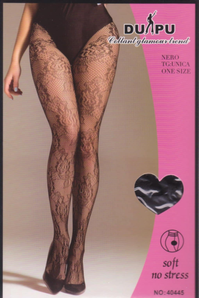 Hulahop čarape sa čipkom model 40445 dizajnirane su za žene koje vole da kroz detalje izraze svoj stil i ženstvenost. Elegantna crna boja uvek ostaje aktuelna, dok spoj mrežaste teksture i nežnih cvetnih ornamenata stvara vizuelno zanimljiv i profinjen izgled koji suptilno ističe noge i doprinosi celokupnoj eleganciji.