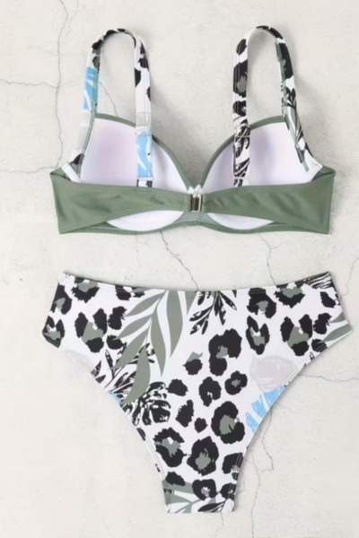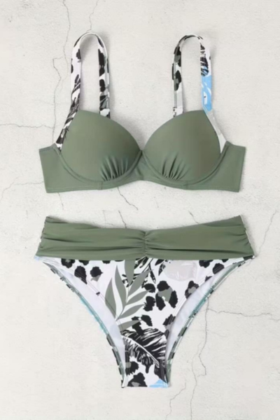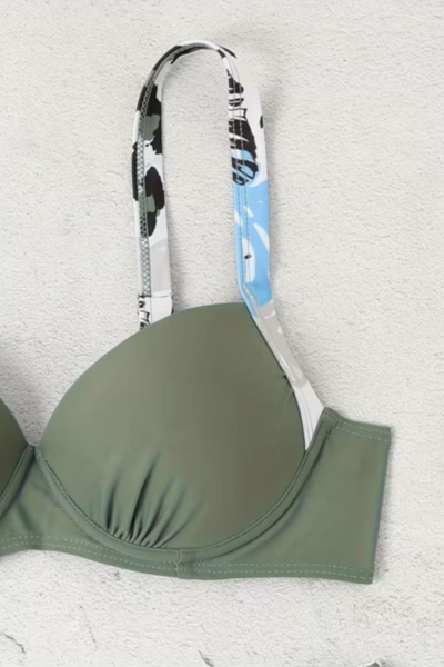 Ženski dvodelni kupaći kostim 26718 idealan je za dame koje žele spoj modernog dizajna, sigurnosti i udobnosti tokom letnjih dana. Maslinasto zelena boja sa suptilnim šarama daje ovom modelu prirodan, ali istovremeno veoma elegantan izgled, koji lako privlači pažnju na plaži ili pored bazena.