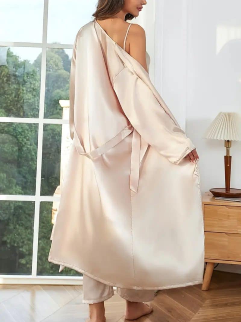 Ovaj prefinjeni trodelni set u elegantnoj krem nijansi sastoji se od dugih satenskih pantalona, lagane majice sa tankim, podesivim bretelama i ogrtača koji zaokružuje ceo izgled elegancijom i stilom.